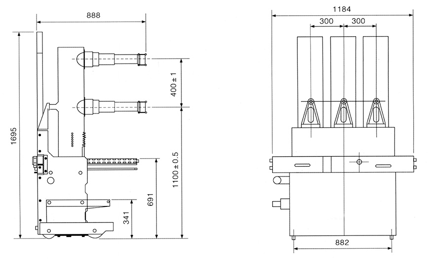 三相滅弧室和相聯(lián)帶電體由三只獨立的環(huán)氧樹脂絕緣筒相隔離,構(gòu)成復(fù)合絕緣結(jié)構(gòu),斷路器滿足正常運行條件下的空氣距和爬距要求,并有效地減小了斷路器的體積。主導(dǎo)電回路真空滅弧室和動靜導(dǎo)電聯(lián)接安裝在絕緣筒內(nèi),使相間距僅為300mm。主回路電氣連接全部采用固定式連接,具有很高的可靠性。絕緣筒安裝在斷路器框架上方。