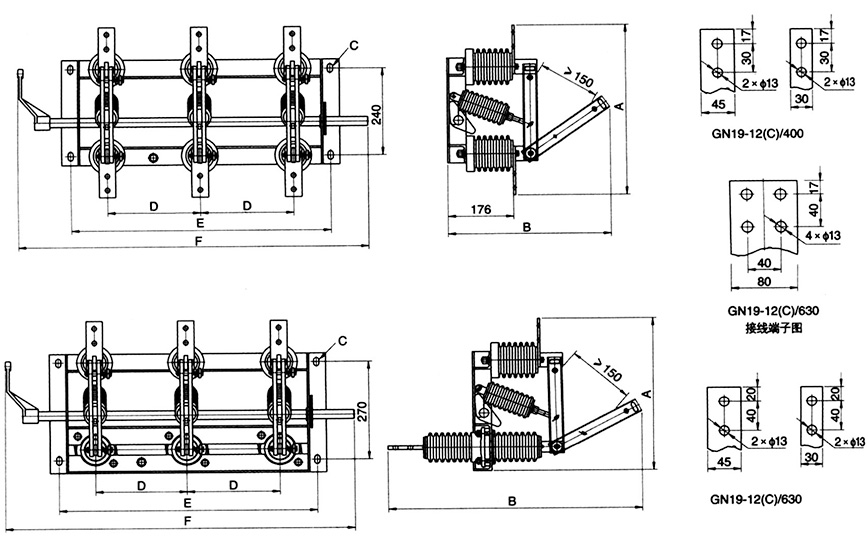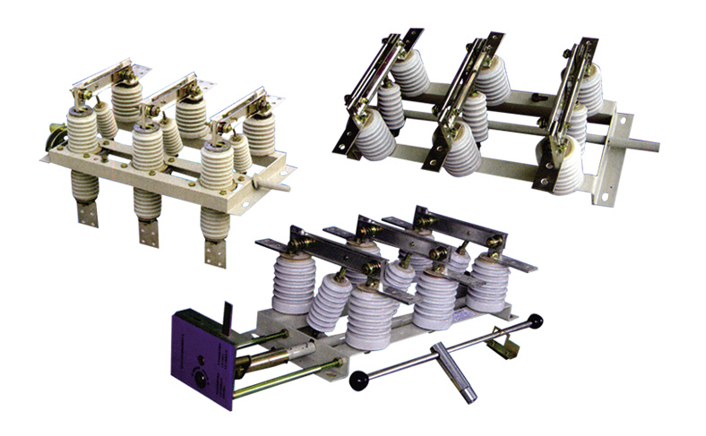 本隔離開(kāi)關(guān)為三極型,由底架、轉(zhuǎn)軸、及杠桿、瓷支柱絕緣子、閘刀及接線板等部分組成。轉(zhuǎn)軸安置在底架上,其上焊有三對(duì)杠桿,杠桿通過(guò)拉桿瓷絕緣子與閘刀相連。轉(zhuǎn)軸伸出底架,其任何一段均可與操作機(jī)構(gòu)相連。