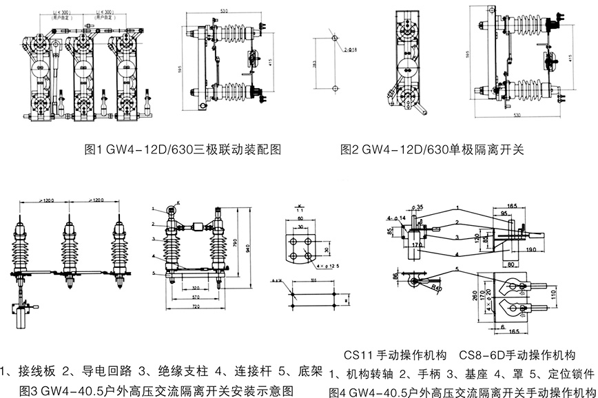 隔離開關(guān)為單極型,也可通過連桿將三極連成能夠聯(lián)動(dòng)的三極型式。配用CS11型或CS8-6D型手動(dòng)機(jī)構(gòu)操作。其中CSl7用于帶雙接地裝置的隔離開關(guān)。(可據(jù)需要配電動(dòng)機(jī)構(gòu))。